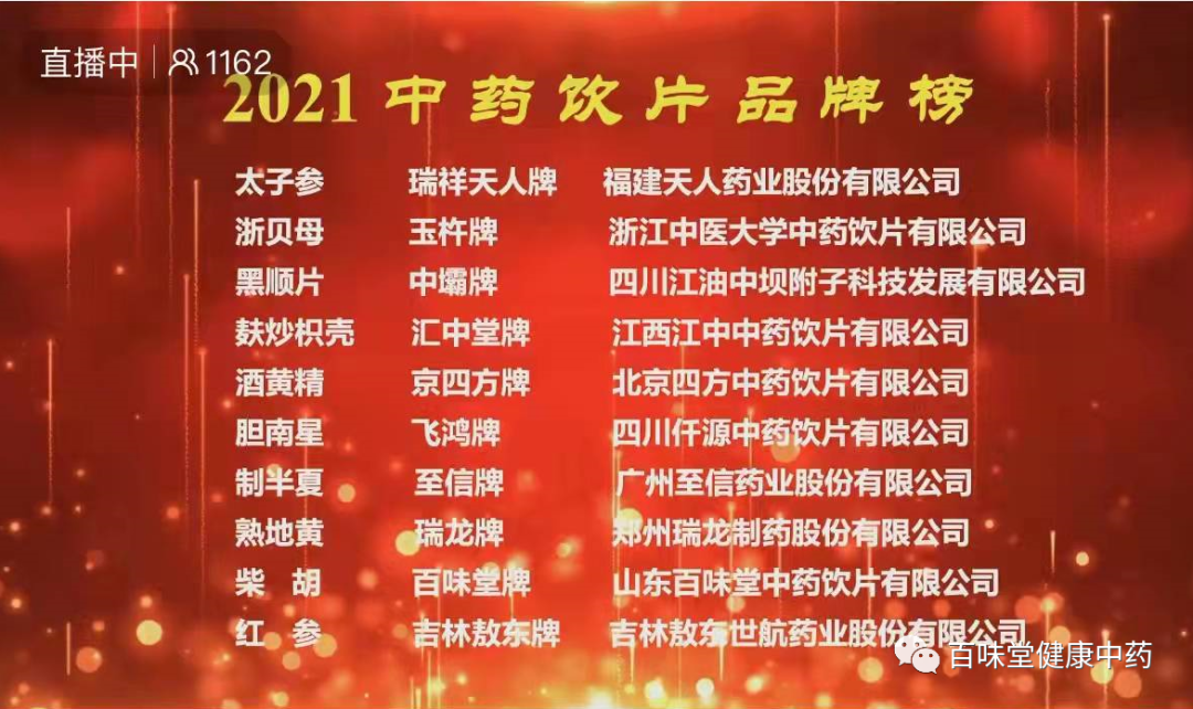 在2021年12月18日召開的“中國中藥協會2021年度產業信息發布會暨分支機構工作會”會議上,山東百味堂中藥飲片有限公司榮登“2021中藥飲片品牌企業榜”。